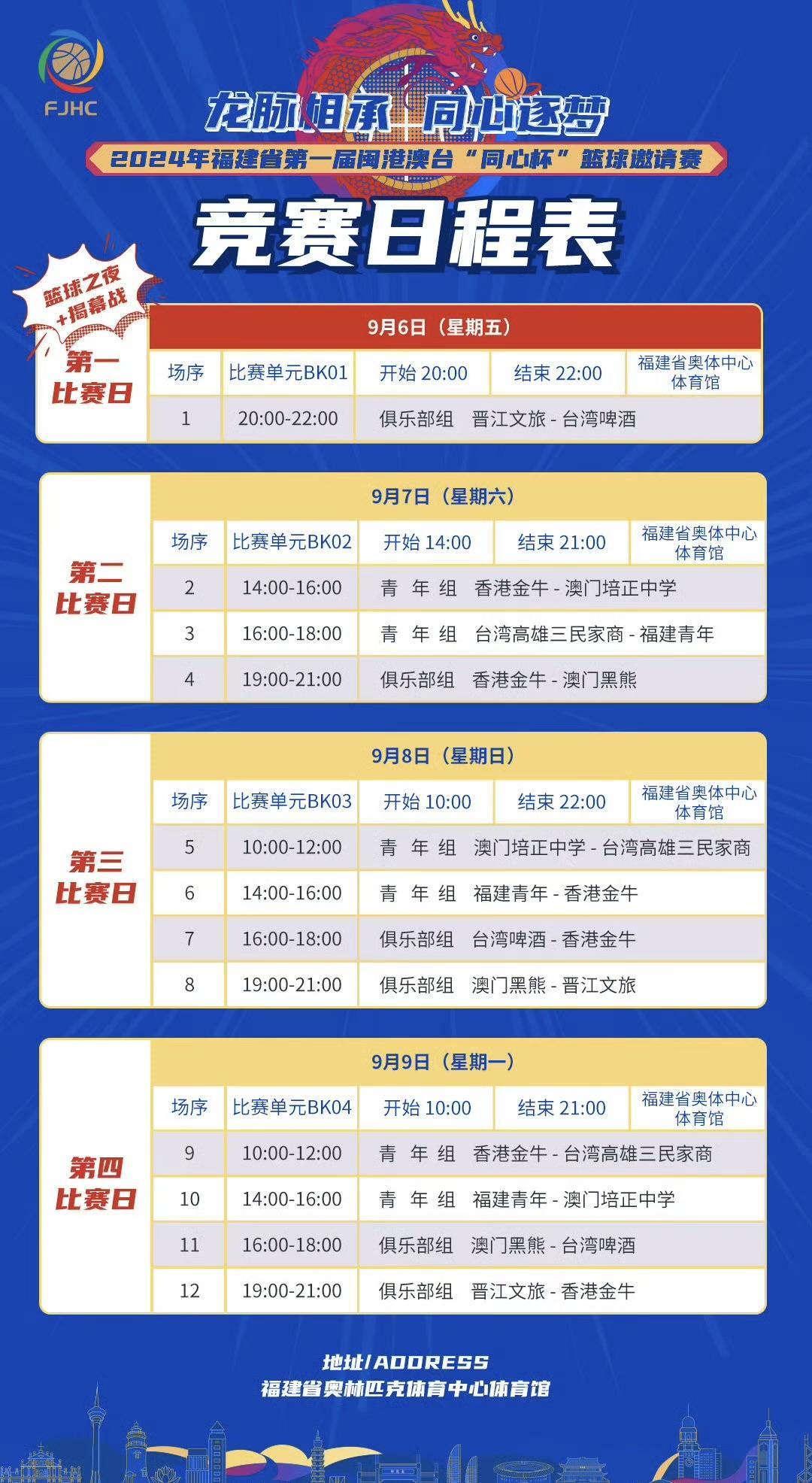 一心杯”篮球邀请赛将于9月6日-9日正在福州进行虎扑09月02日讯 2024年第一届闽港澳台“。以及SBL两届总冠军台湾啤酒俱笑部代表两岸四地俱笑部对赛事冠军张开篡夺来自CBA的福修男篮、NBL劲旅香港金牛俱笑部赛流言板]福建携手香港金牛等队参、ABL澳门黑熊俱笑部加第一届闽港澳台“同心杯”篮球。
