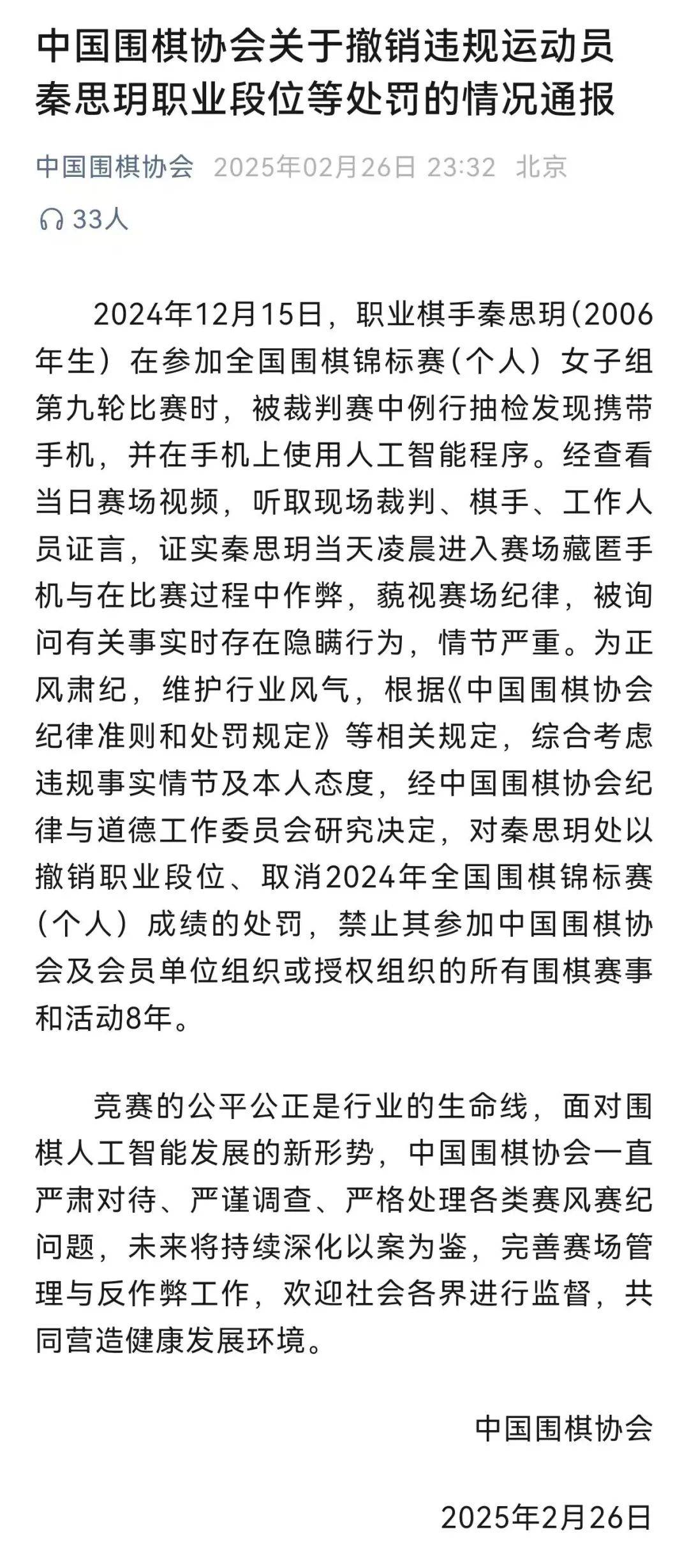 26日2月,宣布处境转达中国围棋协会,隐蔽手机与正在角逐流程中舞弊证据职业棋手秦思玥进入赛场,消角逐成就及禁赛8年的责罚对其作出裁撤职业段位法治热点速览|禁赛8年、撤销段位!、取。下↓(央视网转达全文如)