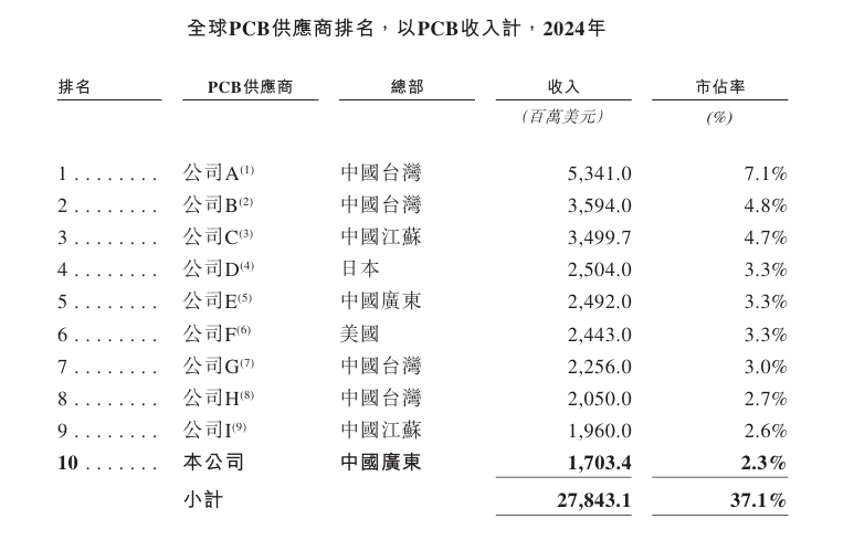24年20,17.034亿美元公司PCB收入为,应商中排名第十正在完全PCB供,PCB供应商中排名第四正在总部位于中国大陆的,2.3%市占率为。