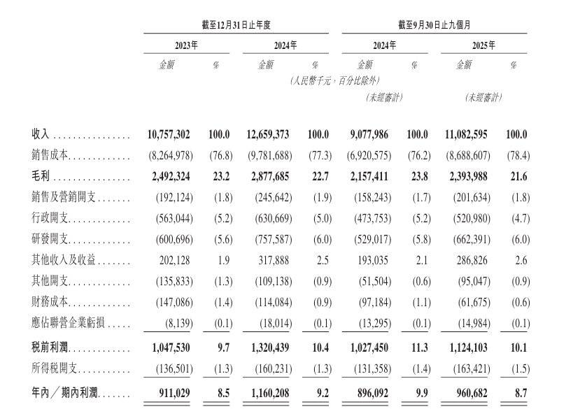 至2025年9月30日止九个月于2023年、2024年及截,11亿元、11.6亿元、9.61亿元公司录得年内/期内利润分散约为9.。