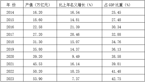 据能够看出从表1的数,字经济领域延长了2.32倍2014-2023年中国数,4.59%年均增速1;了17.30个百分点占GDP的比重升高,92个百分点年均延长1.。