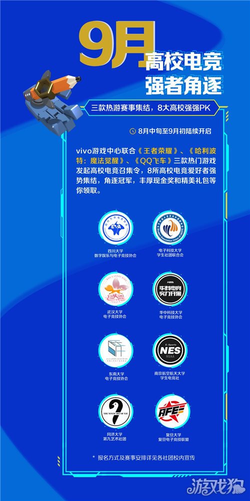 年8月8日2022,游戏节电竞季正式开启vivo游戏中央88。年今,戏节将举办新一轮的升级vivo游戏中央88游,的高校巅峰对决推出4城8校,《QQ飞车》三款热点游戏提议高校电竞纠合令合伙《王者名誉》、《哈利波特:妖术觉悟》、太平洋在线xg111竞喜爱者强势会集、较量冠军邀请8所国内顶级学府的电。